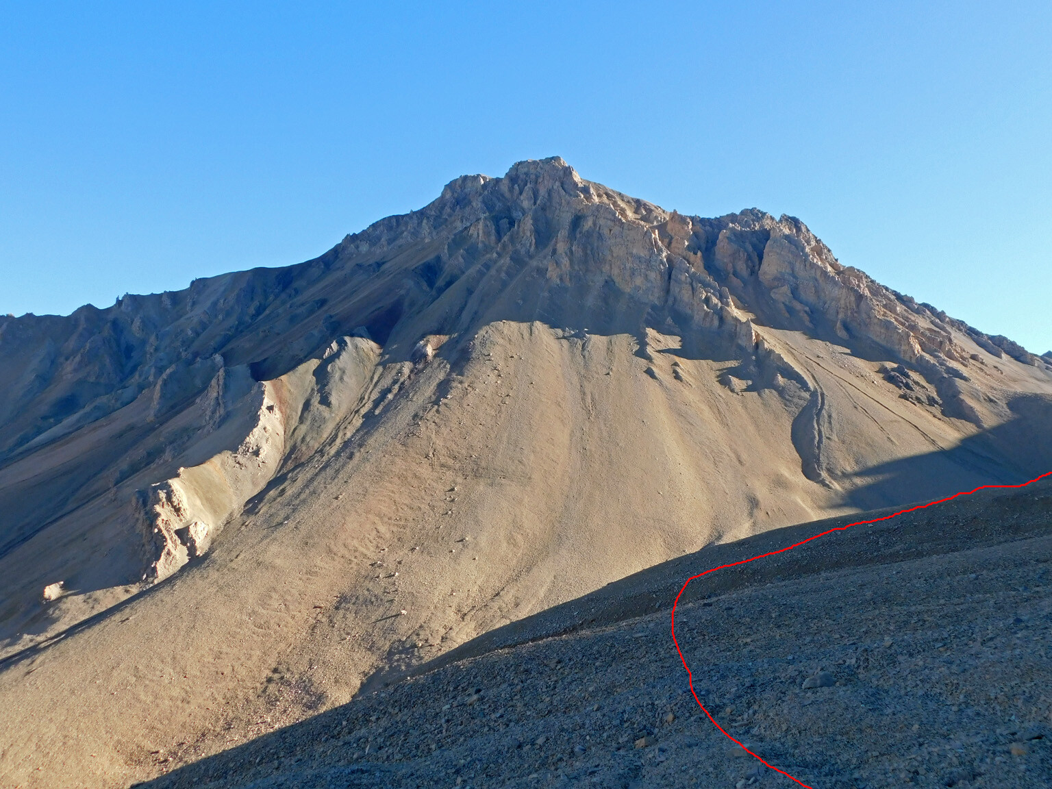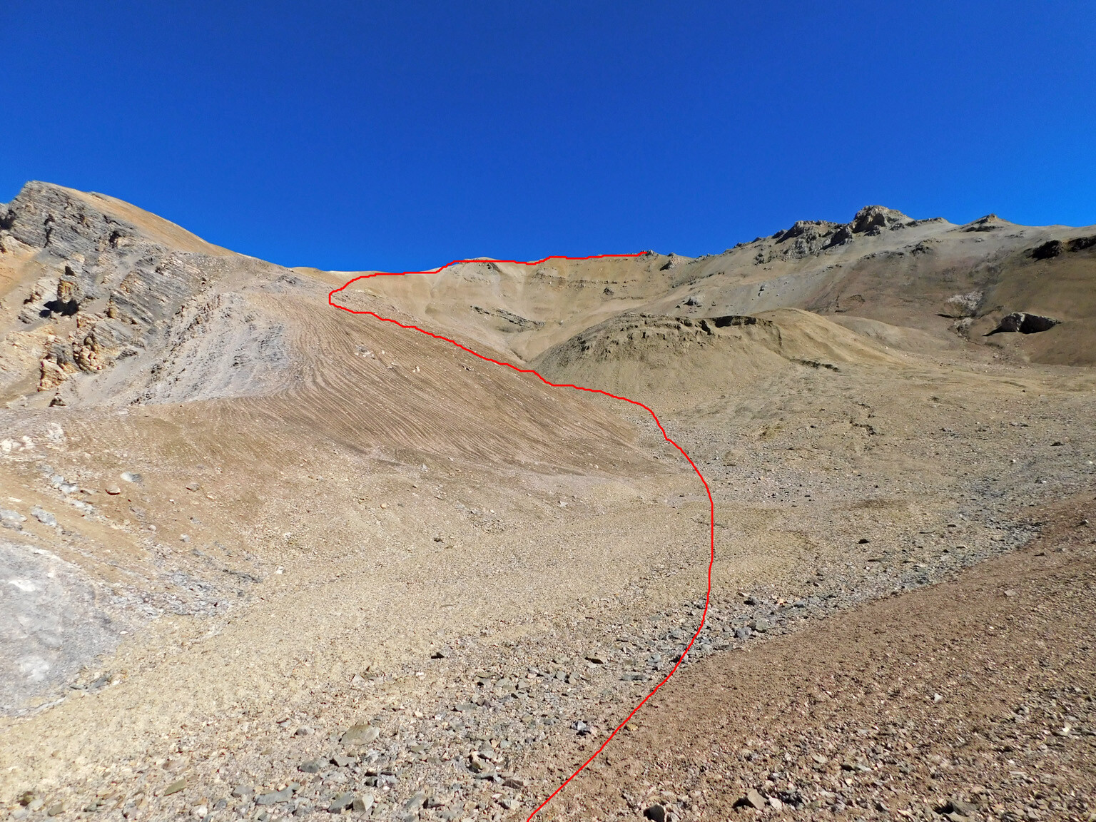 Desde el lugar de campamento se sale en dirección Este hacia la quebrada que proviene del portezuelo que se forma entre los cerros Chacayal y Alto de los Placeres Ver foto 3. Se comienza a subir por esta quebrada hasta pasar por una angostura de ella que puede exigir algún trepe fácil por la roca. Se sigue por acarreos de pendiente suave hasta llegar a un punto a unos 3470m en que la canaleta da un giro hacia la izquierda Ver foto 4.